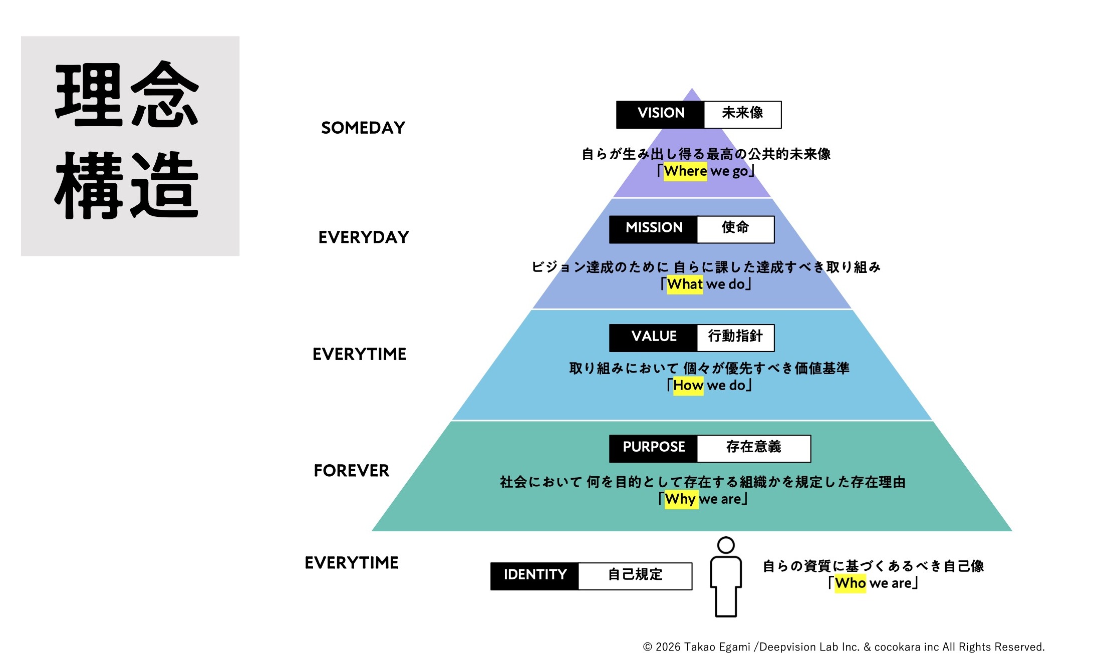 弊社ココカラのファウンダーであり、現在はディープビジョン研究所の代表を務めるブランド戦略コンサルタントの江上隆夫が構築した、理念系のことばの定義とピラミッド構造です。